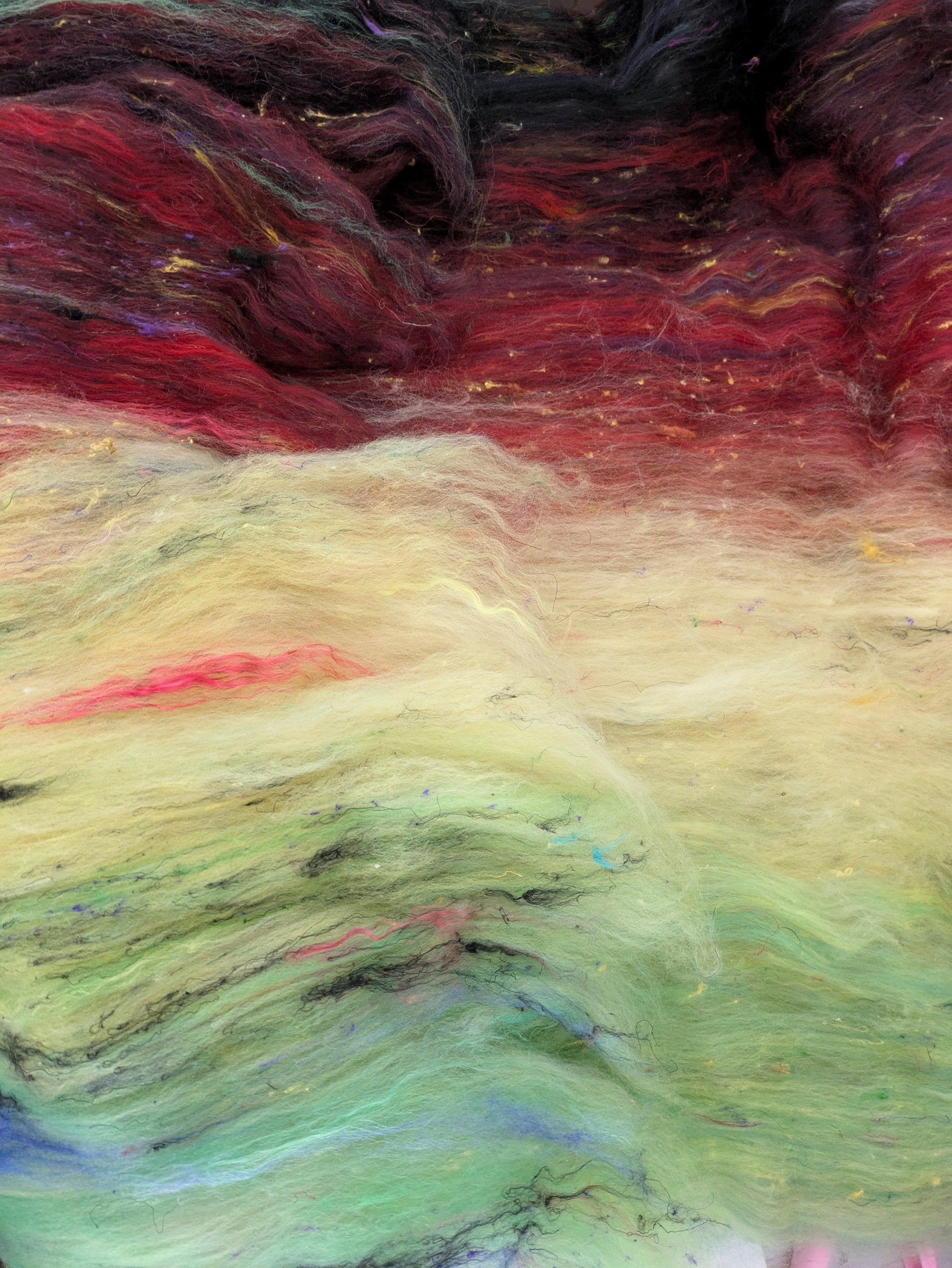 This batt contains merino, mulberry and tussah silk, sari silk and silk noil. Excellent for spinning or felting. Note that this batt has been processed less than my normal fluffy batts for added texture.