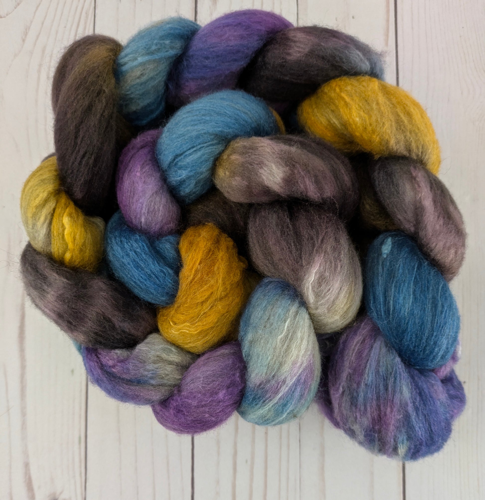 4.2 oz of luxury blend of 60 % polwarth wool, 20% Tibetan yak, and 20% mulberry silk, dyed in my Autumn-inspired "Incantation" colorway. Perfect for next to skin items with desired drape.